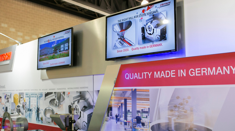 The FRITSCH exhibit booth contained like always new and long standing instrument technologies used for milling and sizing, as well as our promotional video:
