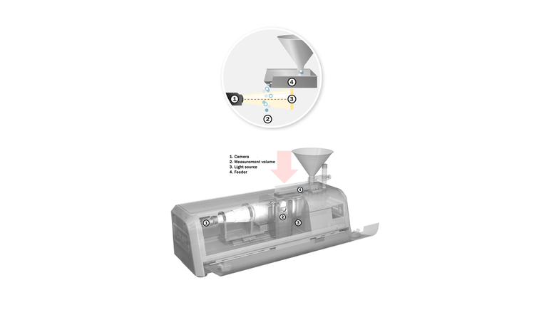 Pour une mesure humide, pour une dispersion idéale, le matériau de l'echantillon est introduit dans un circuit fermé liquide puis aspiré puissamment pour traverser la cellule de mesure, entre la caméra et le stroboscope à LED. Les images enregistrées en continu tout au long de cette opération représentent la base de l'analyse qui présente de vastes possibilités d'évaluation.