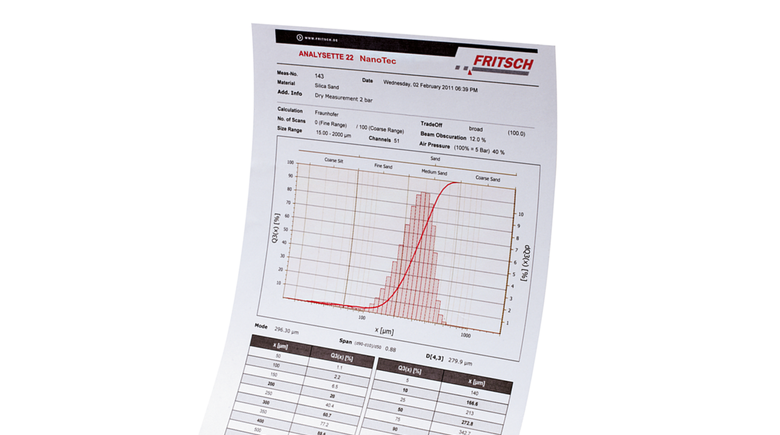 For the control, recording and perfect evaluation of your measuring results, the Laser Particle Sizers ANALYSETTE 22 NeXT Micro and ANALYSETTE 22 NeXT Nano are delivered with the FRITSCH MaS control software in which all user entries, parameters and results are saved automatically and revision-proof in an SQL database. And by integration into a local computer network, all measuring data can also be conveniently analysed on other computers.