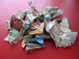 Tests showed that a pre-comminution for example with a 4 mm sieve and an ensuing fine comminution with a 5 mm sieve, can in no case replace the cyclone separator. Rather the opposite is to be noticed. Are the above pictured foils additionally pre-comminuted, the final fineness of 0.5 mm is no longer obtainable. On the sieve accumulates a film which stops the material throughput. Coarse material whirls in the grinding chamber and therefore keeps the sieve clear.