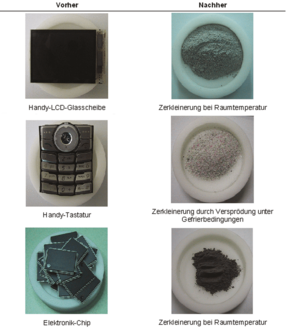 Good experiences of the comminution of single electronic components were made with the Vibratory Micro Mill PULVERISETTE 0, embrittled with liquid nitrogen in the cyro-box.