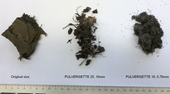 | 110385 - Action 2: Comparison of unground piece (left), pre ground sample with PULVERISETTE 25 (middle), and fine ground sample after grinding with PULVERISETTE 19 and 0,75mm sieve cassette. |