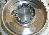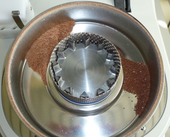 | Opened grinding chamber after 15 seconds: the ground sample use to lie loose inside of the collecting vessel. The impact rotor and the sieve ring use to be free of residues; higher amounts of sample can be ground. |
