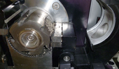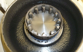 Opened grinding chamber after 30 seconds (typical grinding sound has stopped): Rotor and sieve cassette are almost free of sample, only a bit of lightweight material uses to be in front of the first fixed knife. Probably left over particles might get ground too when the machine will run some longer (e.g. for 1-2 minutes). |