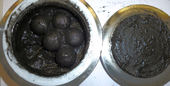 Before grinding, we tested the pH-value of small black fragments and found, that the sample uses to be very alkaline. To prevent corrosion on grinding parts, we always recommend washing and drying alkaline samples until the pH-value will be neutral before feeding. In this trial, we wiped off all grinding parts with a damped cloth and finally with alcohol.