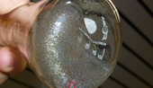 | After 10 minute of grinding: a bit of sample has been given into a 50 ml Erlenmeyer flask which was filled with 30 ml ethanol. After dispersing with ultrasound, metal flakes sunk to the ground of the flask. The red circle marks a ~ 2 mm long flake which could be spotted. |
