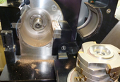 | Opened grinding chamber after 12 minutes of total grinding time. The disk milling rotor with indexable inserts and knives has been placed onto the lid. The sieve cassette is still in place. Only a minimum amount of sample use to remain inside of the grinding chambe. A longer grinding time is not recommended. |
