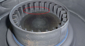 | Pictures: | Opened grinding chamber after 20 seconds, the openings of the 0,08 mm sieve ring use to blocked by > 95 %. Sample starts to build up in upper and lower area of the sieve ring (see red ellipse mark). |
