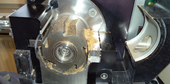| Opened grinding chamber after 60 seconds of grinding. Loose sample use to remain mainly on top of the first fixed knife where the standard funnel will enter the grinding chamber. Most of the sample on top of the sieve insert can be vacuumed off. Also the rotor can be removed easily by sliding off of its coil when a cleaning step will become necessary. |