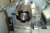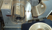 | Opened grinding chamber: sieve cassette, lid and rotor are still in position, some flat particles use to lie loose on top of the sieve cassette and will not get grabbed by the rotor anymore. Cleaning can be performed rapidly by vacuuming with a soft brush. |