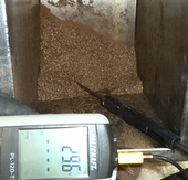 We placed the sample overnight into a fridge with – 18°C. Next day, sample has been taken out and brought into our laboratory. With a standard contact thermometer, a sample temperature of – 9,4 °C has been detected inside the heap of wood chips.