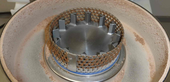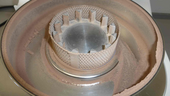 | Pictures: | Opened grinding chamber after 20 grams of embrittled sample has been ground. Also with this trial, melted sample is sticking on the outside of the used 1,5 mm sieve ring. |