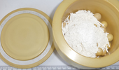 | Pictures: | 100g of sample filled into a 500 ml bowl made of ZrO2 with 70x 15 mm grinding balls before grinding |