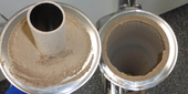 | Opened cyclone separator with plenty of adhesive sample inside. About 20 grams of sample was brushed into the attached collecting glass. |