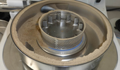 | Pictures: | Opened grinding chamber after comminution of 150 g pre cut cricket sample. A lot of fine ground sample was brushed into the cyclone. |