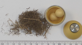 | Pictures: | 0,5 grams of original sample, next to the bowl (equipped with 2x 15 mm Ø grinding balls). |