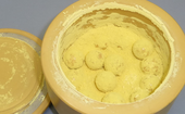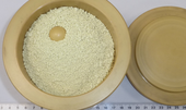 | Pictures: | Original sample material (100 grams) inside a 500 ml bowl made of zirconium oxide which was equipped with 25x 20 mm Ø grinding balls (one is visible inside sample heap). |