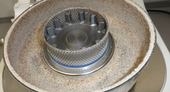 | Opened grinding chamber after 50 seconds: used sieve ring and impact rotor are mainly free of residues. Surely higher amounts of embrittled sample can be ground per batch. |