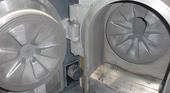 | Opened grinding chamber after comminution of ~ 207 grams of manganese ore. A bit of loose sample (partly attached by electrostatic charge) was removed rapidly by vacuuming with a soft brush. |