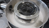 A Vibratory Feeder LABORETTE 24 could be used to automatize the feeding of sample into the PULVERISETTE 14. For the last batch of 500 grams, only 11:50 minutes were required. With the higher feed rate, the system temperature rose to 42 °C (still not problematic to grind higher amounts). After the complete kilogram was comminuted, still only ~ 20 % of openings inside the sieve shells were clogged.