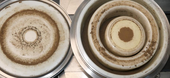 | Pictures: | Also the sieve shell set with 0,2 mm trapezoidal perforations were not clogged significantly. |