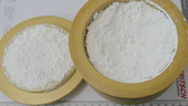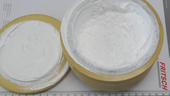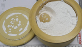 We added 255 grams of TiO2 sample into the bowl and ground the sample for 60 seconds at maximum speed (400 rpm). On the opposite grinding position, a properly tared bowl, filled with sand was placed. After one minute of dry grinding, the bulk volume of ground sample almost filled the 500 ml bowl to its maximum. We did not find any larger fragments of sample. The sample started sticking lightly (see lid on separate photo #2).