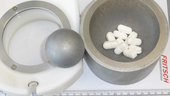 We used the desired stainless-steel mortar and grinding ball. Typically, agate or zirconium oxide is used for pharmaceutical applications. With steel equipment, the grinding process is noisier and we used the optional sound absorbing hood to cover the mill.