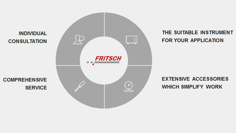 Tout ce qui est indispensable au broyage, au tamisage, à la division et à la mesure est fourni par une source unique, FRITSCH :